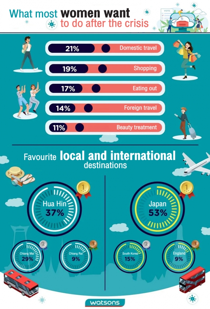 The survey, by the international health and beauty retailer from April 8 to 22, asked 4,000 women aged between 18 and 39 what they wanted to do once the crisis is over. Of the respondents, 21 per cent said they wanted to visit natural attractions within the country, and 37 per cent chose Hua Hin, 29 per cent Chiang Mai and 9 per cent Chiang Rai.