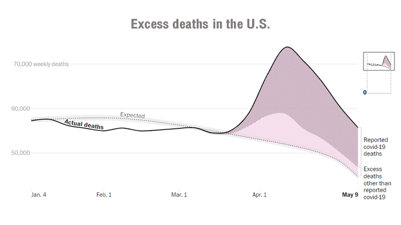 A research team led by the Yale School of Public Health used historical data on all deaths between 2015 and early 2020, published by the National Center for Health Statistics (NCHS), to model the number of deaths that would normally be expected each week from March 1 to May 9. The estimate takes into account seasonal variations, intensity of flu epidemics and year-to-year variations in mortality levels.