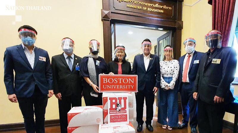 Phonpimol Pathomsak, president of the Boston University Alumni Association along with key members of the alumni, donate 1,200 face shields today (June 1) as part of the Boston University Day for Global Giving.