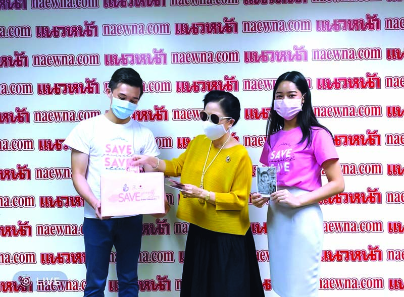 น.ส.อรญา ตุลยนิติกุล (อิง) นิสิตชั้นปีที่ 1 และนายเจตน์ นาวีวิจิตร (เจเจ) นิสิตชั้นปีที่ 2 คณะแพทยศาสตร์ จุฬาลงกรณ์ มหาวิทยาลัย พรีเซ็นเตอร์โครงการ มาร่วมรณรงค์รับบริจาค กับ ผาณิต พูนศิริวงศ์ ประธานเจ้าหน้าที่ นสพ.แนวหน้า