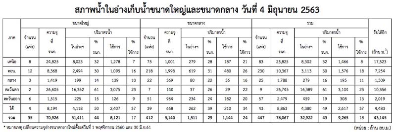 สำหรับสถานการณ์น้ำล่าสุดช่วงต้นฤดูฝน เริ่มมีน้ำไหลเข้าเขื่อนขนาดใหญ่ทั้ง 35 แห่ง ทั่วประเทศ รวมแล้วมากกว่า 150 ล้านลูกบาศก์เมตร(ลบ.ม.) และมีแนวโน้มเพิ่มขึ้นต่อเนื่อง ซึ่งกรมจะกักเก็บน้ำไว้ทั้งหมด เพื่อนำมาใช้ในกรณีเกิดภาวะฝนทิ้งช่วง และใช้ในฤดูแล้งปี 2563/64 โดยปริมาณในเขื่อนขนาดใหญ่และขนาดกลางทั่วประเทศ ณ วันที่ 4 มิถุนายน 2563 มี 32,922ล้าน ลบ.ม. คิดเป็นร้อยละ 43 ของปริมาณการกักเก็บน้อยกว่าช่วงเดียวกันในปี 2562 จํานวน 6,380 ล้าน ลบ.ม. รับน้ําช่วงฤดูฝนได้อีก 43,145 ล้าน ลบ.ม. โดยเป็นปริมาณน้ำเฉพาะเขื่อนขนาดใหญ่รวม 31,411 ล้านลบ.ม. และสามารถรับน้ำได้อีก 39,515 ล้านลบ.ม.