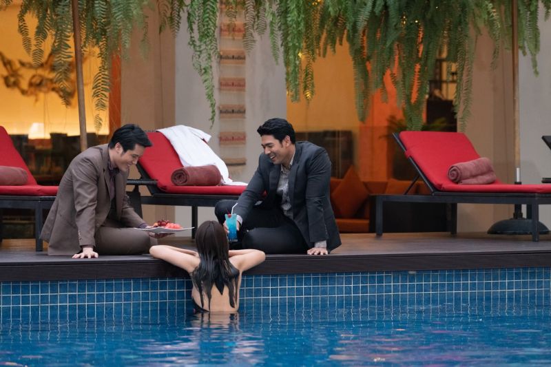 บรรยากาศฉากนี้เป็นฉากที่ ลินิน (เปรี้ยว-ทัศนียา) กำลังแหวกว่ายใส่ชุดว่ายน้ำอยู่กลางสระในโรงแรม โดยมีพงษ์ (อานัส ฬาพานิช) และ บัณฑูร (กลม-นพพล) ช่วยกันเอาใจ คนหนึ่งถือเครื่องดื่ม คนหนึ่งถือผลไม้ ซึ่งลินินพึ่งพอใจมากที่มีแต่คนมารุมให้ความสนใจเธอ ขณะเดียวกันนั่น ทินภัทร (บิ๊กเอ็ม-กฤตฤทธิ์) เดินมากับ เจ้าแสงแก้ว (ฝ้าย- ณิชานันท์) ลินินเห็นก็ไม่พอใจที่เห็นสองคนนี้เดินมาด้วยกัน เลยแกล้งกระโดดลงน้ำตรงจุดที่ทินภัทรกับเจ้าแสงแก้วยืนอยู่แบบจงใจให้น้ำกระเด็นโดนทินภัทร