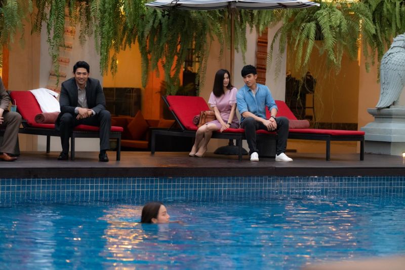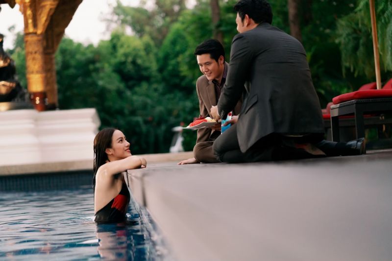 บรรยากาศฉากนี้เป็นฉากที่ ลินิน (เปรี้ยว-ทัศนียา) กำลังแหวกว่ายใส่ชุดว่ายน้ำอยู่กลางสระในโรงแรม โดยมีพงษ์ (อานัส ฬาพานิช) และ บัณฑูร (กลม-นพพล) ช่วยกันเอาใจ คนหนึ่งถือเครื่องดื่ม คนหนึ่งถือผลไม้ ซึ่งลินินพึ่งพอใจมากที่มีแต่คนมารุมให้ความสนใจเธอ ขณะเดียวกันนั่น ทินภัทร (บิ๊กเอ็ม-กฤตฤทธิ์) เดินมากับ เจ้าแสงแก้ว (ฝ้าย- ณิชานันท์) ลินินเห็นก็ไม่พอใจที่เห็นสองคนนี้เดินมาด้วยกัน เลยแกล้งกระโดดลงน้ำตรงจุดที่ทินภัทรกับเจ้าแสงแก้วยืนอยู่แบบจงใจให้น้ำกระเด็นโดนทินภัทร