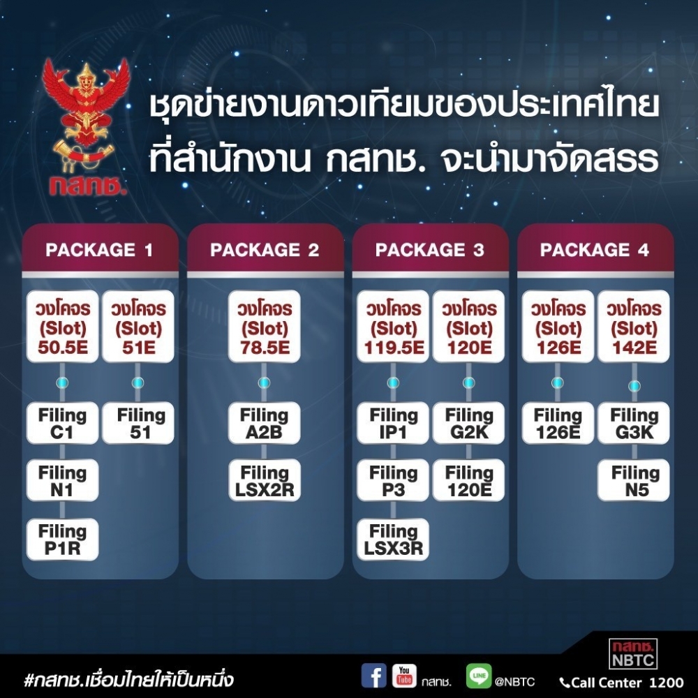 The NBTC will combine the slots and related satellite network filing into four packages, namely 50.5 degrees East and 51 degrees East; 78.5 degrees East; 119.5 degrees East and 120 degrees East; and 126 degrees East and 142 degrees East.