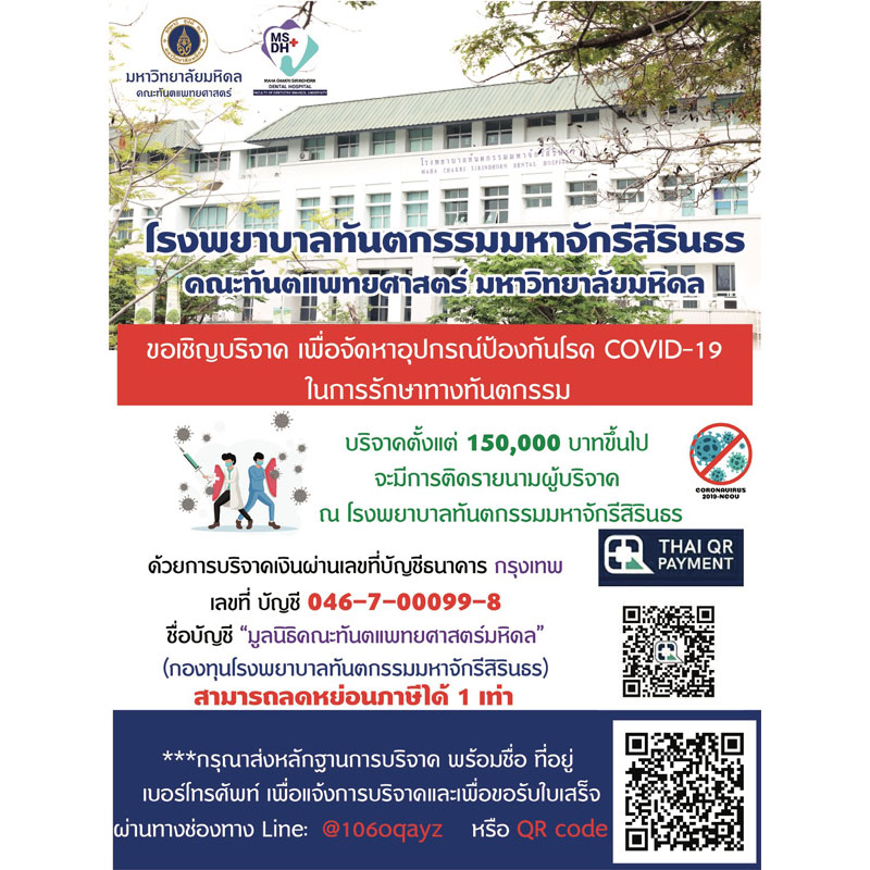 คณะทันตแพทยศาสตร์ มหาวิทยาลัยมหิดล เชิญชวนประชาชนร่วมบริจาคสมทบทุนเพื่อนำมาปรับปรุงห้องทันตกรรมและซื้ออุปกรณ์ป้องกันการแพร่ระบาดของเชื้อโควิด-19 ซึ่งใช้งบประมาณค่อนข้างสูงพร้อมปรับการรักษาทางทันตกรรมแบบ “New Normal” หรือความปกติใหม่ เพื่อลดความเสี่ยงในการติดเชื้อและเพื่อความปลอดภัยของทั้งคนไข้และทันตแพทย์