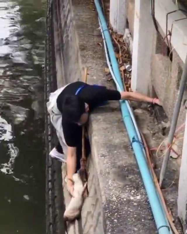 The man uses a broom to try and fish the desperate animal out of the water. As passersby cheer him on from the bridge, he finally achieves success by plucking the cat from the water.