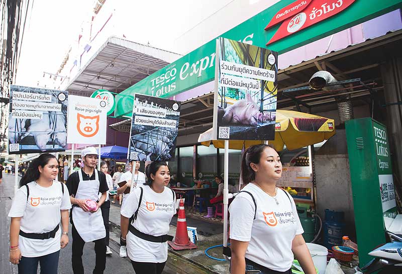 องค์กรพิทักษ์สัตว์แห่งโลก (World Animal Protection) ได้ดำเนินโครงการเลี้ยงหมูด้วยใจ (Raise Pigs Rights) ในประเทศไทยมาตั้งแต่พ.ศ.2561 โดยเริ่มจากการรณรงค์เพื่อยกเลิกการใช้คอกขังแม่หมูไปสู่การเลี้ยงแบบรวมกลุ่ม เพื่อประโยชน์ต่อทั้งสวัสดิภาพของหมูและผลิตภัณฑ์เนื้อหมูที่มีความปลอดภัยสู่ผู้บริโภคซึ่งได้รับความร่วมมือเป็นอย่างดีจากหลายภาคส่วนทั้งในส่วนผู้ผลิตหมูและห้างค้าปลีกต่างๆ โดยเฉพาะอย่างยิ่ง เทสโก้ โลตัสที่ได้ประกาศพันธสัญญาในการจัดจำหน่ายเนื้อหมูในรูปแบบแพ็กจากฟาร์มที่ไม่มีการขังแม่หมูตั้งท้องในกรงและมีการเลี้ยงแบบรวมกลุ่ม (Group Sows Housing) ภายในปีพ.ศ.2570 ซึ่งถือเป็นความสำเร็จก้าวใหญ่ที่เกิดขึ้นจากการเรียกร้องของผู้บริโภค