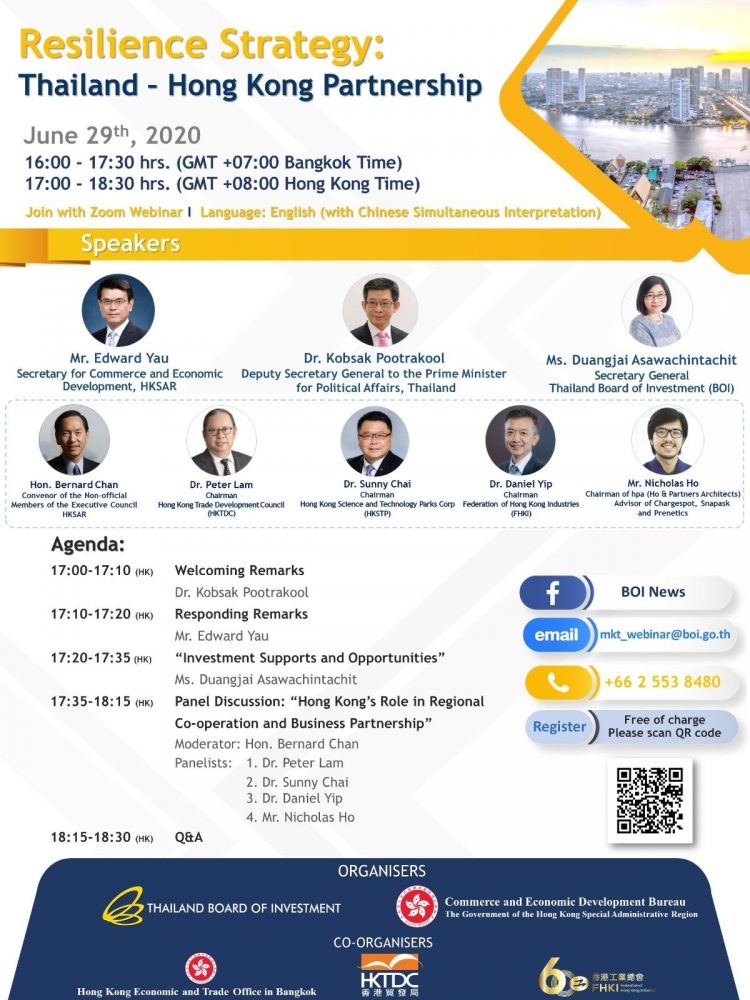 HKTDC has designated June as “Thailand month” with a series of online events. A highlight is the webinar co-organised by the Thai Board of Investment and Hong Kong’s Commerce and Economic Development Bureau, featuring Kobsak Pootrakool, deputy secretary-general to the Prime Minister, HKTDC’s Lam and Hong Kong’s Commerce and Economic Development Secretary Edward Yau. The webinar will be held from 4pm-5.30 pm on June 29.