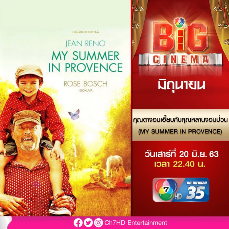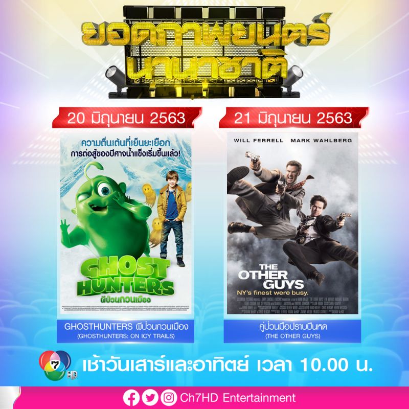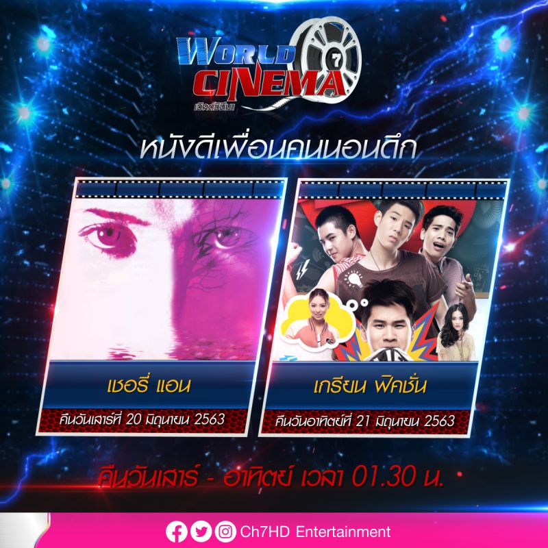 ประเดิมเช้าวันเสาร์ที่ 20 มิถุนายนนี้ เวลา 10.00 น. ด้วย ยอดภาพยนตร์นานาชาติ พบกับภาพยนตร์ฝรั่งสัญชาติเยอรมัน “ผีป่วนกวนเมือง (GHOST HUNTERS : ON ICY TRAILS)” การต่อสู้กับจอมปีศาจน้ำแข็งโบราณของทอมและผองเพื่อน จากนั้นในวันเดียวกันเวลา 18.00 น. ช่วงพิเศษภาพยนตร์ดังที่คิดถึง กับภาพยนตร์ไทย “รวมพลคนลูกทุ่งเงินล้าน (LOOKTUNG MILLIONAIRE)” ปฏิบัติการของเหล่านักร้องลูกทุ่งที่มารวมตัวกันเพื่อไปทอดผ้าป่า และตามหาเงินล้านที่หายไป ต่อด้วย บิ๊กซิเนมา เวลา 22.40 น. เอาใจคนนอนดึกด้วยภาพยนตร์ฝรั่งสุดอบอุ่น “คุณตาจอมเฮี๊ยบกับคุณหลานจอมป่วน (MY SUMMER IN PROVENCE)” เรื่องราววุ่น ๆ ของคนต่างวัยที่ต้องไปอาศัยอยู่กับคุณตาสุดเฮี๊ยบที่เมืองโปรวองซ์ ปิดท้ายด้วย เวิลด์ซิเนมา เวลา 01.15 น. กับภาพยนตร์ไทย “เชอรี่ แอน (SHERRY ANNE)” เรื่องราวความรัก 4 เศร้า ที่มีความซับซ้อนซ่อนเงื่อนยิ่งกว่า นวนิยาย