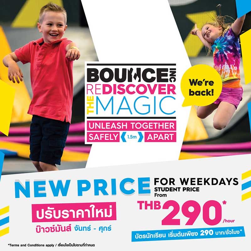 บ๊าวซ์ ประเทศไทย (Bounce Thailand) อาณาจักรแทรมโพลีนในร่ม นำเข้าจากประเทศออสเตรเลีย ชวนคนรักการออกกำลังกายแนวเอ็กซ์ตรีม มาเด้งดึ๋ง ปลดปล่อยพลังกันอีกครั้งพร้อมมาตรการรักษาความสะอาดที่เข้มงวด และเว้นระยะห่างเพื่อความปลอดภัย เพราะที่กว้างๆ ของบ๊าวซ์ ทำให้เว้นระยะห่างจากกันได้สบาย ความสนุกที่จะทำให้ทุกคนกระโดดกันได้อย่างเต็มที่ ปลดปล่อยกันได้สุดเหวี่ยงเหมือนเดิม และเพื่อเป็นการต้อนรับการกลับมา บ๊าวซ์ได้มีการปรับราคาใหม่ คุ้มยิ่งกว่ากับวันธรรมดา ราคาพิเศษ!! บัตรนักเรียนเพียง 290 บาท (ปกติ 390 บาท) และบัตรทั่วไปราคาเพียง 390 บาท (จากปกติ 490 บาท)