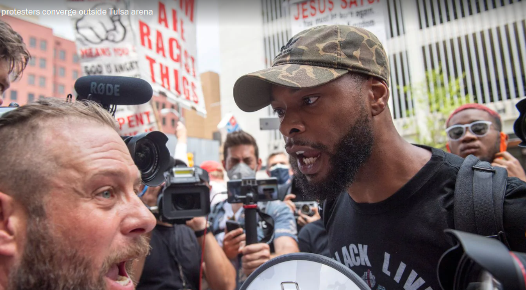 By the time Trump took the stage, there had been tense verbal confrontations outside but no reports of violence. Civilians carrying military-style rifles and pistols wandered amid the crowds, claiming they wanted to keep people safe, while Tulsa police and National Guard troops restrained and separated opposing sides.