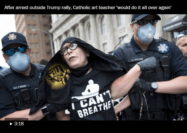 A little after noon on Saturday, she showed her ticket to police and stepped into the outdoor area cordoned off for the event. When knelt down to pray, she was asked to leave. When she refused, she was arrested at the request of the Trump campaign.