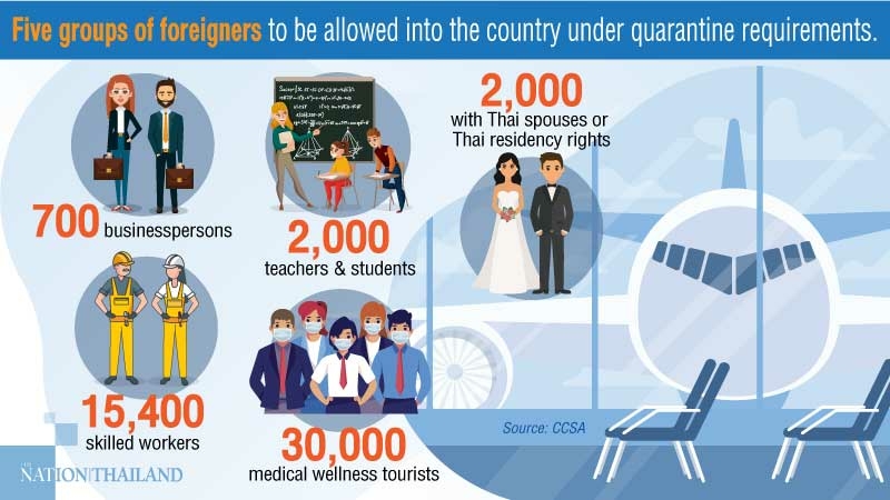 Of the groups that have registered seeking entry, there are 700 business people and investors; 15,400 skilled labourers and experts; around 2,000 foreigners married to Thais or permanent residents of Thailand, around 2,000 educational personnel, teachers and students, and 30,000 medical and wellness tourists.