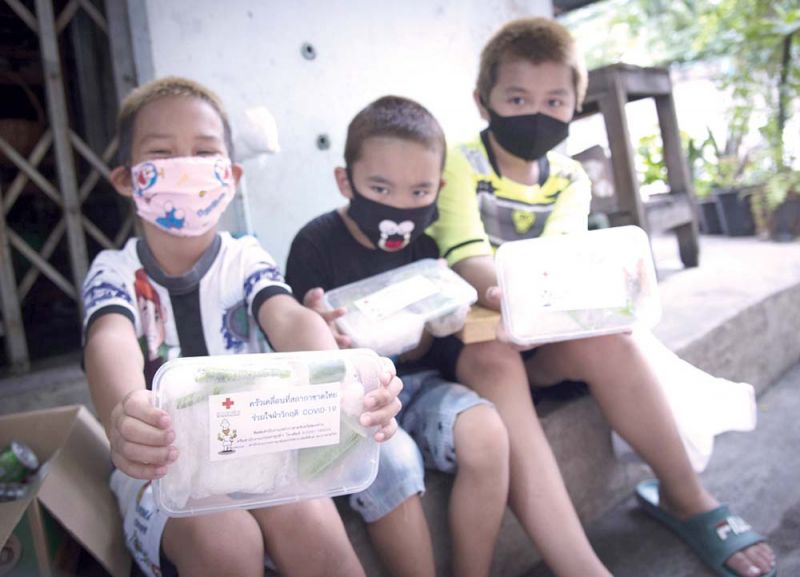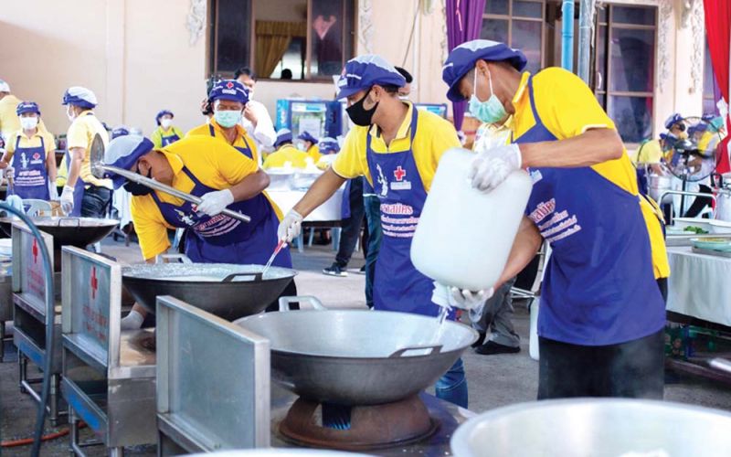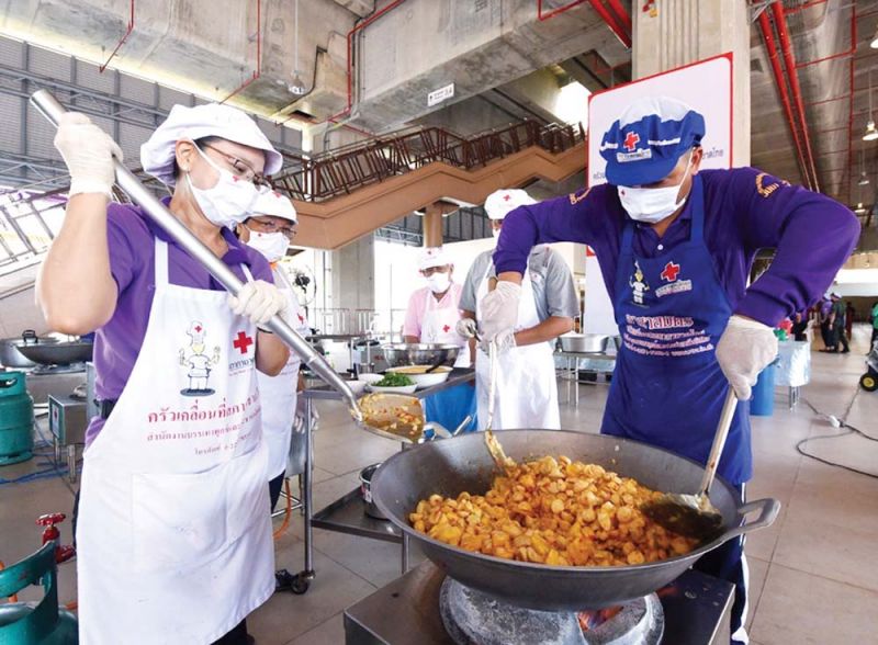 ขรรค์ ประจวบเหมาะ ผู้อำนวยการสำนักงานจัดหารายได้ สภากาชาดไทย กล่าวว่า “พลังน้ำใจของทุกท่านที่ส่งมอบให้กับสภากาชาดไทย ผ่านแคมเปญ “63 บาท สู้ COVID-19 ปี’63” โดยสำนักงานจัดหารายได้จัดขึ้นนั้นเพื่อระดมทุนสนับสนุนการช่วยเหลือผู้ได้รับผลกระทบจากสถานการณ์ดังกล่าว โดยสภากาชาดไทยได้รับพระราชทานพระราชานุญาตจัดตั้งครัวพระราชทาน อุปนายิกาผู้อำนวยการสภากาชาดไทย ด้วยการแจกจ่ายอาหารปรุงสุกใหม่ให้กับประชาชน ซึ่งดำเนินการไปเป็นที่เรียบร้อยแล้วใน 5 จังหวัด ได้แก่ สมุทรสาคร วันที่ 8-17 พฤษภาคม 2563 มอบอาหารปรุงสุก จำนวน 15,599 ชุด, สระแก้ว วันที่20-29 พฤษภาคม 2563 มอบอาหารปรุงสุกจำนวน 17,823 ชุด, นนทบุรี วันที่ 24 พฤษภาคม-2 มิถุนายน 2563 มอบอาหารปรุงสุก จำนวน 28,781 ชุด, วัดปทุมวนารามราชวรวิหาร กทม. วันที่ 26พฤษภาคม-4 มิถุนายน 2563 มอบอาหารปรุงสุก จำนวน 22,419 ชุด, ขอนแก่น วันที่ 11-20 มิถุนายน 2563 มอบอาหารปรุงสุก จำนวน 20,000 ชุดรวมทั้งสิ้น 104,622 ชุด และวันที่ 25 มิถุนายน-4 กรกฎาคม 2563 ดำเนินการจัดตั้งครัวพระราชทาน อุปนายิกาผู้อำนวยการสภากาชาดไทย ณ ศาลากลาง จ.นครราชสีมา