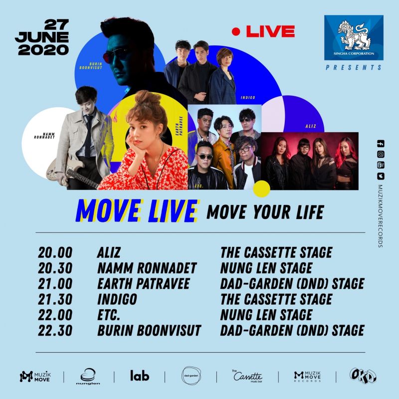 สนุกยกค่ายไปกับ “Singha Corporation Presents MOVE LIVE MOVE YOUR LIFE CONCERT (สิงห์ คอร์ปอเรชั่น พรีเซนต์ มูฟไลฟ์ มูฟ ยัวร์ ไลฟ์ คอนเสิร์ต)” ได้รวม 6 ศิลปินจากค่าย Muzik Move Records (มิวซิกมูฟ เรคคอร์ดส) ได้แก่ บุรินทร์ บุญวิสุทธิ์, เอิ๊ต – ภัทรวี ศรีสันติสุข, แหนม – รณเดช วงศาโรจน์, วง ETC.(อีทีซี), วง INDIGO(อินดิโก้) และวง ALIZ(เอลิซ) มาไลฟ์คอนเสิร์ตแบบจุใจ ส่งตรงบรรยากาศจาก 3 ร้าน 3 เวทีไปถึงมือคุณ ตั่งแต่เวลา 2 ทุ่มตรง ตลอด 3 ชั่วโมงเต็ม ที่จะทำให้คืนวันเสาร์ที่ 27 มิถุนายนนี้ สนุกได้เหมือนอยู่กลางเอกมัย!