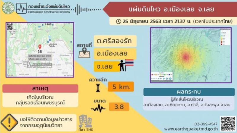 The Earthquake Observation Division of the Thai Meteorological Department said the quake happened at 9.37pm. The division reported that the quake could be felt by locals for a short time, including those residing in Kudpong, Chaiyaphreug and Nakhaem subdistricts. People in adjacent Chiang Khan and Tha Li districts also reported that they felt the tremor.