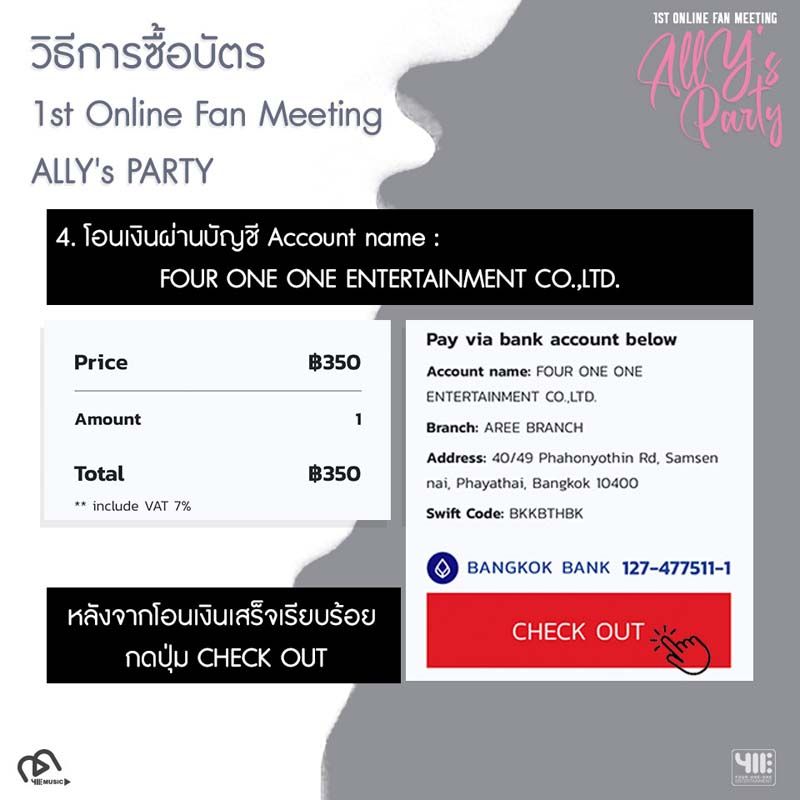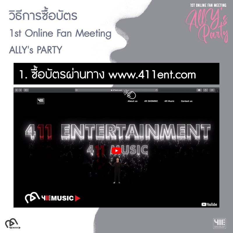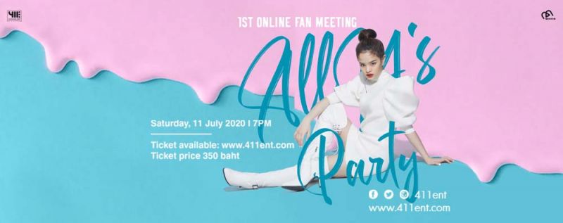 เรียกว่าพลาดไม่ได้เข้าไปอีก! เมื่อค่ายเพลงมาแรงแห่งยุค “โฟร์ วัน วัน มิวสิก” (Four One One Music หรือ 411 Music) ของบิ๊กบอส กึ้ง–เฉลิมชัย มหากิจศิริ เฉลยเซอร์ไพรส์ให้หายสงสัยกันไปเรียบร้อยแล้วว่า… งาน “เฟิร์ส ออนไลน์ แฟน มีตติ้ง : แอลลี่ส์ ปาร์ตี้” (1st Online Fan Meeting : ALLY’s PARTY) อีเวนต์ใหญ่เต็มตัวครั้งแรกในชีวิตของ แอลลี่ (ALLY) – อชิรญา นิติพน ซึ่งจะมาในรูปแบบนิวนอร์มอลออนไลน์คลายคิดถึงแฟนๆ ผ่านระบบ ZOOM วันเสาร์ที่ 11 กรกฎาคม 2563 นี้ ผู้ร่วมงานทุกท่านจะได้ฟังเพลงใหม่แกะกล่องและชมเพอร์ฟอร์แมนซ์ของสเปเชียลแทร็กสุดพิเศษก่อนใคร!!