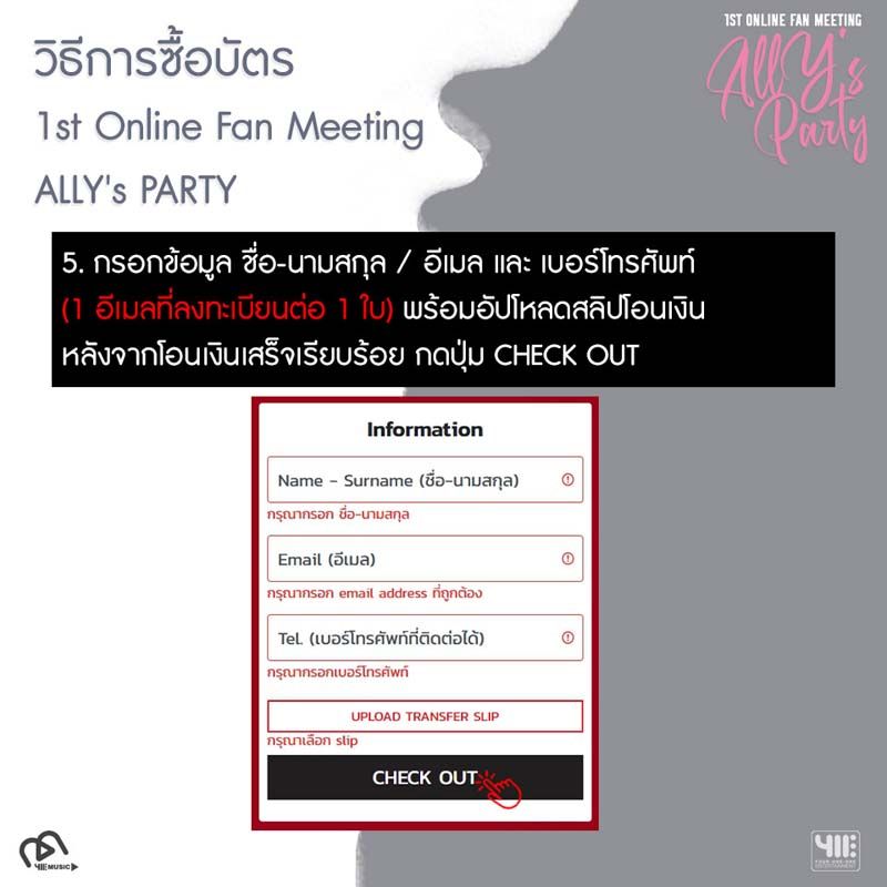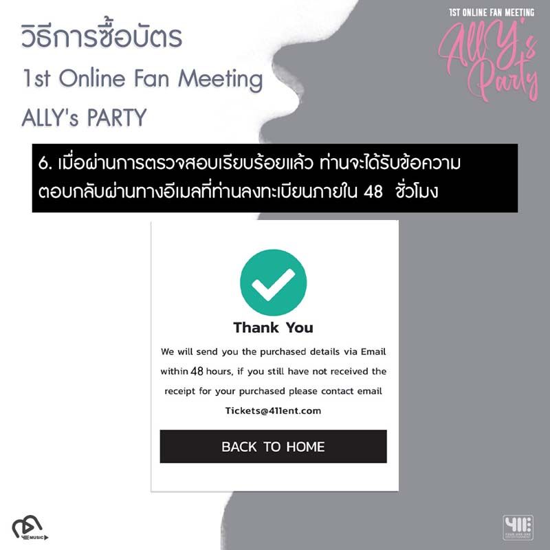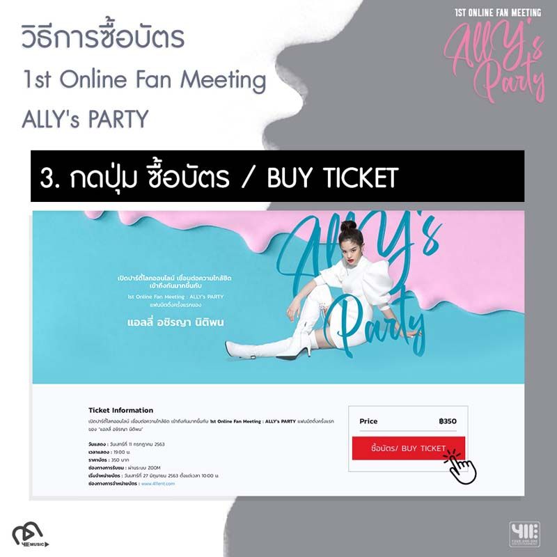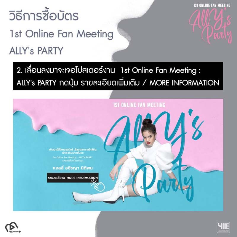 งานนี้เจ้าตัวขอมาสปอยล์เองเลยว่า “ความพิเศษของงาน 1st Online Fan Meeting : ALLY’s PARTY ครั้งนี้นะคะ แอลลี่ก็อยากจะชวนแฟนๆ มาร่วมสนุกกันเยอะๆ นะคะ เพราะว่าจะมี Special Surprise มากๆ เลย คือการเปิดตัวเพลงใหม่ซึ่งเป็น Special Track ของแอลลี่ในปาร์ตี้นี้เป็นที่แรกเลย ถ้าเกิดว่าอยากฟังเต็มเพลงก็สามารถฟังกันได้ในงานวันเสาร์ที่ 11 กรกฎาคม 2563 นี้ ตั้งแต่เวลา 19:00 น. ผ่านระบบ ZOOM มาดูกันเยอะๆ ให้หายคิดถึงเลยนะคะ เจอกันค่ะ” แอลลี่ กล่าว (ชมคลิปได้ที่ https://youtu.be/VB5-u3qKDW0)