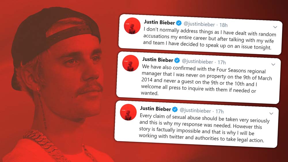 O อยู่ๆ ก็มีงานเข้า จัสติน บีเบอร์ หลังถูกสาวนิรนาม กล่าวหาว่าเขาพาเข้าโรงแรม ไปล่วงละเมิดทางเพศ โดยคู่กรณีคือสาวนามว่า“แดเนียล” ได้ออกมาทวีตอ้างว่า ในวันที่ 9 มีนาคม 2014จัสตินได้ชวนเธอและเพื่อนๆ เข้าโรงแรมโฟร์ ซีซั่นส์ ในรัฐเท็กซัสหลังจากแสดงคอนเสิร์ตเสร็จ ซึ่งจัสตินพาเธอเข้าห้องพักแยกจากทีมงาน และได้ปลุกปล้ำขืนใจเธอ พอรู้ข่าว จัสตินเลยรีบออกมาชี้แจงแก้ข่าวทันทีทันใด ยืนยันว่าเรื่องนี้ไม่เป็นความจริง ช่วงเวลานั้นเขากำลังแสดงอยู่บนเวทีที่ในนครออสตินและมีอดีตแฟนสาว เซเลนา โกเมซ อยู่ด้วย พร้อมกับนอนค้างกับกลุ่มเพื่อนในบ้านพัก AirBnB รวมถึงโพสต์ภาพหลักฐานการจองที่พัก และใบเสร็จการเข้าพักที่โรงแรม Westinจึงไม่มีทางไปอยู่ที่โรงแรม Four Seasons และไม่มีทางที่จะไปล่วงละเมิดทางเพศคู่กรณีได้แน่นอน จัสตินยังบอกอีกว่าหลังจากปรึกษากับ เฮลีย์ บอลด์วิน ภรรยาแล้ว ก็ตัดสินใจว่าจำเป็นต้องออกมาพูดความจริง และจ่อฟ้องดำเนินคดี
