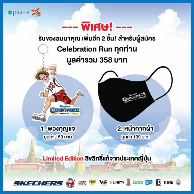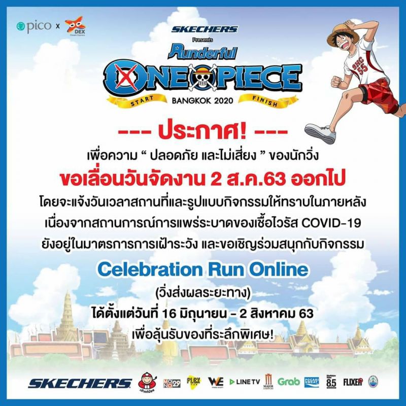 บริษัท ปิโก (ไทยแลนด์) จำกัด (มหาชน) ผู้นำทางด้าน Brand Activation ร่วมกับ บริษัท ดรีม เอกซ์เพรส (เดกซ์) จำกัด ผู้นำเอ็นเตอร์เทนเมนต์ด้านคอนเทนต์ลิขสิทธิ์จากประเทศญี่ปุ่น ผู้จัดงาน SKECHERS presents Runderful One Piece Bangkok 2020 “ 20 ปีวิ่งไม่ทิ้งเพื่อน ” เพื่อเฉลิมฉลอง 20 ปี การ์ตูนวันพีซ ได้มีความประสงค์ขอเลื่อนวันจัดงาน จากเดิมนั้นได้มีกำหนดจัดกิจกรรม Celebration Run (วิ่งแข่งขัน) ทั้ง 2 ระยะ (Fun Run 5 KM.และ Mini Marathon 11.5 KM.) ในวันอาทิตย์ที่ 2 สิงหาคม 2563 ณ มักกะสัน พาร์ค @แอร์พอร์ทลิงค์ มักกะสัน กรุงเทพฯ โดยจะแจ้งวันเวลาและสถานที่จัดงานใหม่ให้ทราบในภายหลัง และเพิ่มกิจกรรม Celebration Run Online (วิ่งส่งผลระยะทาง) เพื่อให้นักวิ่งโจรสลัดหมวกฟางได้ร่วมสนุก พร้อมลุ้นรับของรางวัลพิเศษ โดยจะเริ่มกิจกรรมให้ผู้ที่สมัครได้ร่วมสนุก “ ส่งผลระยะทาง ” ตามระยะที่ได้สมัครไว้ ทั้ง 2 ระยะ (Fun Run 5 KM.และ Mini Marathon 11.5 KM.) ได้ตั้งแต่วันที่ 16 มิถุนายน – 2 สิงหาคม 2563 และทางผู้จัดงานจะจัดส่ง Race Pack (เสื้อ + BIB + เหรียญ) พร้อมของสมนาคุณ Limited Edition ลิขสิทธิ์แท้จากประเทศญี่ปุ่น เพิ่มเติม จำนวน 2 ชิ้นคือ 1. พวงกุญแจ (มูลค่า 159 บาท) 2. หน้ากากผ้า (มูลค่า 199 บาท) ตามภาพประกอบ แทนคำขอบคุณผู้สมัครทุกท่านที่ยังคงร่วมกิจกรรมต่อไป
