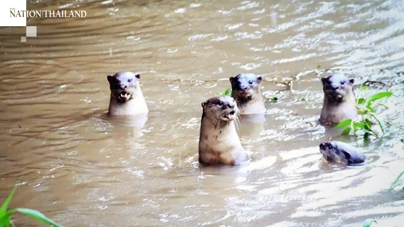 A large happy family of otters was spotted in a canal near a pumping station in Muang Ranong’s Bang Rin subdistrict.