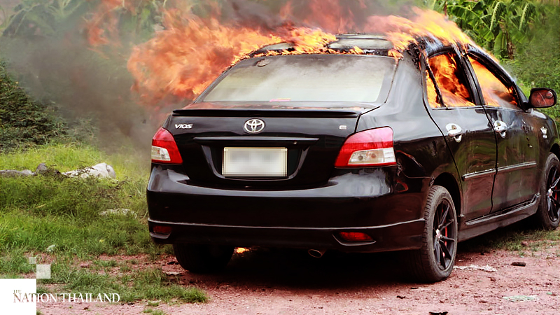 The incident took place in a deserted area, on the opposite side of Thong Niam Temple in Nong Khaem district. The body of the dead man, identified as Krisanapong, 40, was found lying in the car. Police found a beer bottle, which could have been a container for oil, together with several evidence of documents and fuels.