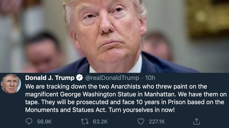 “We are tracking down the two Anarchists who threw paint on the magnificent George Washington Statue in Manhattan. We have them on tape. They will be prosecuted and face 10 years in Prison based on the Monuments and Statues Act,” Trump wrote Tuesday morning. “Turn yourselves in now!”