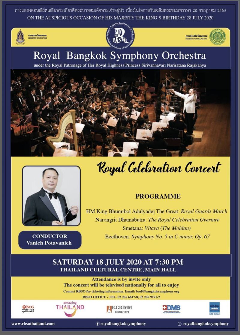 มูลนิธิรอยัลแบงค์คอกซิมโฟนีออร์เคสตร้า ร่วมกับกรมส่งเสริมวัฒนธรรม กระทรวงวัฒนธรรมและการท่องเที่ยวแห่งประเทศไทย โดยความสนับสนุนของ บี.กริม, BDMS, เมืองไทยประกันภัย และ มูลนิธิเอสซีจี ขอเชิญชมคอนเสิร์ตเฉลิมพระเกียรติพระบาทสมเด็จพระเจ้าอยู่หัว เนื่องในโอกาสวันเฉลิมพระชนมพรรษา 28 กรกฎาคม 2563 รายการ“Royal Celebration Concert” บรรเลงโดยวง Royal Bangkok Symphony Orchestra (RBSO) กำหนดแสดงในวันเสาร์ที่ 18 กรกฎาคม 2563 เวลา 19.30 น. ณ หอประชุมใหญ่ ศูนย์วัฒนธรรมแห่งประเทศไทย