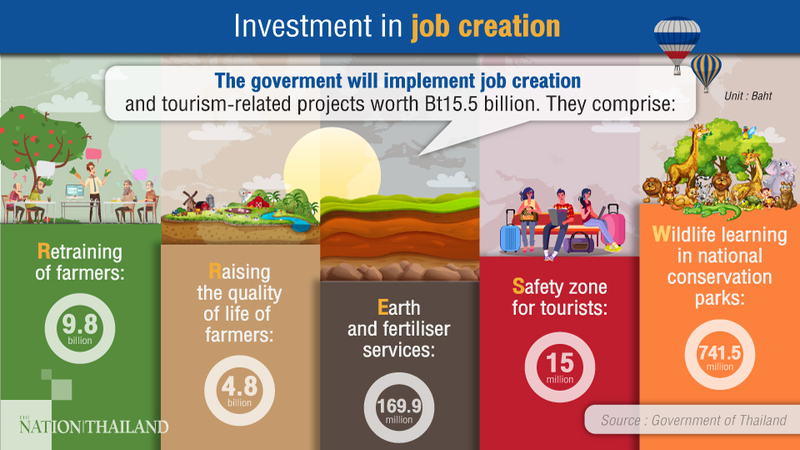 First, the Agriculture and Cooperatives Ministry will launch retraining projects for farmers with a budget of Bt9.8 billion. The projects are expected to create 8,018 jobs and generate income for 44,099 farmers nationwide.