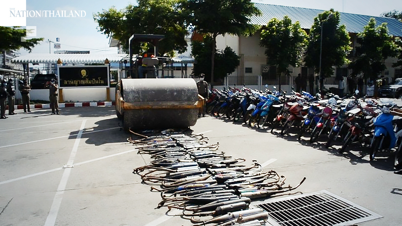 Police then crushed the seized exhaust pipes with a steamroller in public to prevent the recycling of parts and use them for illegal motorcycle modification.