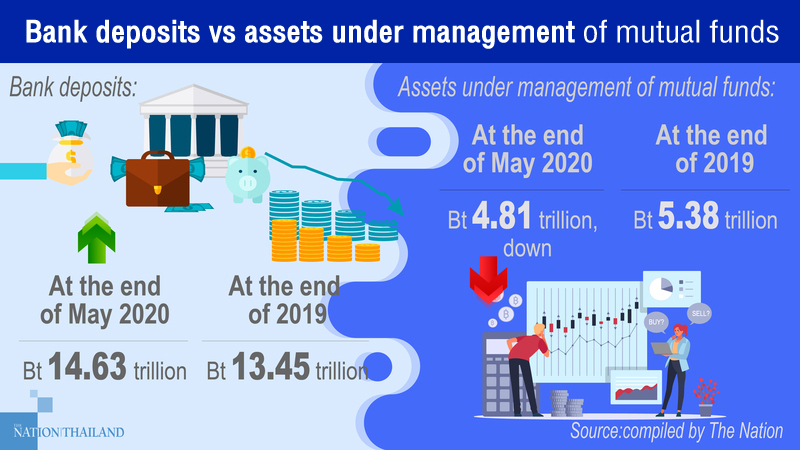 Naris Sathapholdeja, head of TMB Analytics, said the increase in deposits was at the expense of mutual fund management businesses. Assets under management (AUM) of the mutual fund industry dropped by about 10 per cent from the end of last year. AUM at the end of May was worth Bt4.81 trillion, down from Bt5.38 trillion at the end of last year.