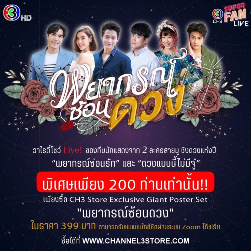 แฟนๆ เตรียมตัวให้พร้อม ช่อง 3 จับโปรเจ็กต์ใหม่ล่าสุด “Channel 3 Super Fan Live!”ครั้งแรก โดย“ก้อง-ปิยะ”ผู้สร้างสรรค์ความบันเทิงได้เผยถึงรูปแบบในการจัดงานเป็นวาไรตี้โชว์รูปแบบใหม่สไตล์New Normalครบวงจร ทั้งละครแฟนมีตติ้ง คอนเสิร์ต และยังมี Superstar Exclusive Live!การส่งไม้ต่อของละครสายมูแห่งปี “พยากรณ์ซ่อนรัก” ให้กับละคร“ดวงแบบนี้ไม่มีจู๋”ที่คุณจะได้ใกล้ชิดติดขอบจอมากกว่าที่เคยแบบ Interactive Entertainment พิเศษสำหรับ Lucky Fans 200 ท่าน เท่านั้น! เพียงซื้อ CH3 Store Exclusive Giant Poster Set “พยากรณ์ซ้อนดวง”ในราคา399 บาท ผ่าน http://www.Channel3store.comรับสิทธิใกล้ชิดและร่วมกิจกรรมกับศิลปินดาราผ่านแอปพลิเคชั่น Zoom Cloud Meetings!!หรือสามารถชมสดฟรี ทุกเครือข่ายเฉพาะที่ AIS PLAYเท่านั้น!