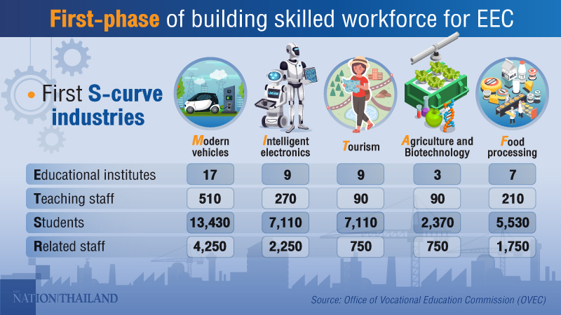 Personnel will also be required for new S-curve industries in other EEC provinces, namely Chanthaburi, Sa Kaew, Trat, Prachinburi and Nakhon Nayok. The industries targeted here are automobiles, smart electronics, tourism, food processing, industrial robotics, aviation, logistic and digital business.