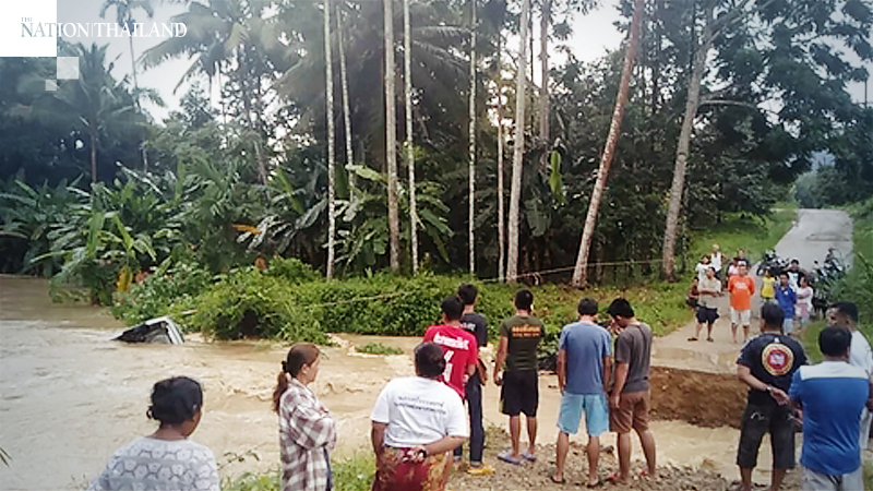 A road in Nakhon Si Thammarat was torn apart by heavy floods, creating a stream which pulled in a car carrying two teachers and a five-year-old on Thursday (July 16).