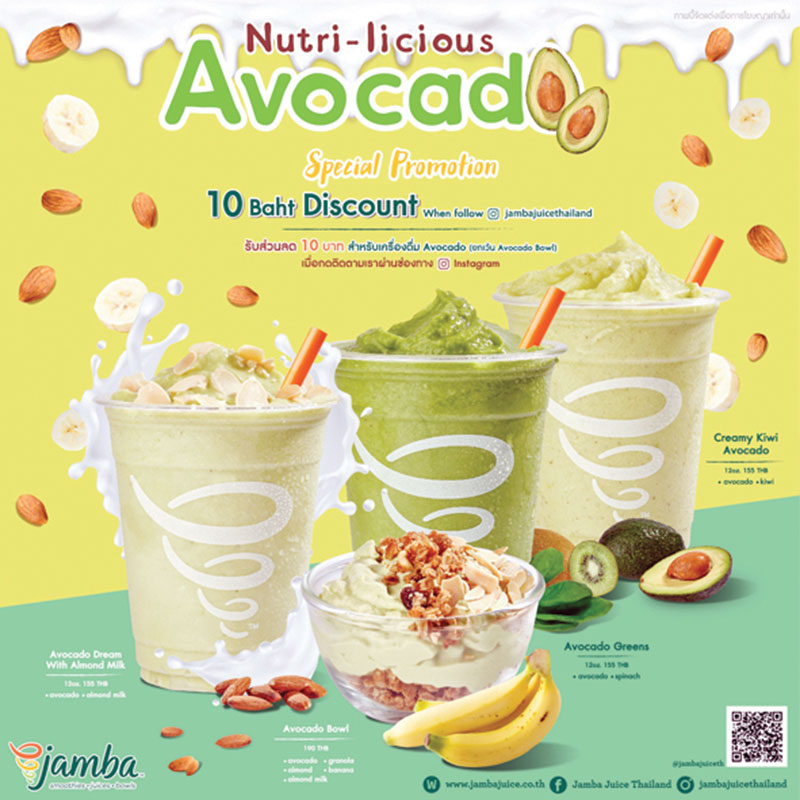 Jamba Juice ชวนชิมเมนูใหม่“Nutri-licious Avocado” 4 เมนูแสนอร่อยได้แก่ Creamy Kiwi Avocado,Avocado Dream With Almond Milk, Avocado Greens และ Avocado Bowl ราคาเริ่มต้นแก้วละ 155 บาท ถึง 12 ก.ย.ที่ ร้านแจมบาร์ จูซ ทั้ง 6 สาขา ใกล้บ้านคุณ