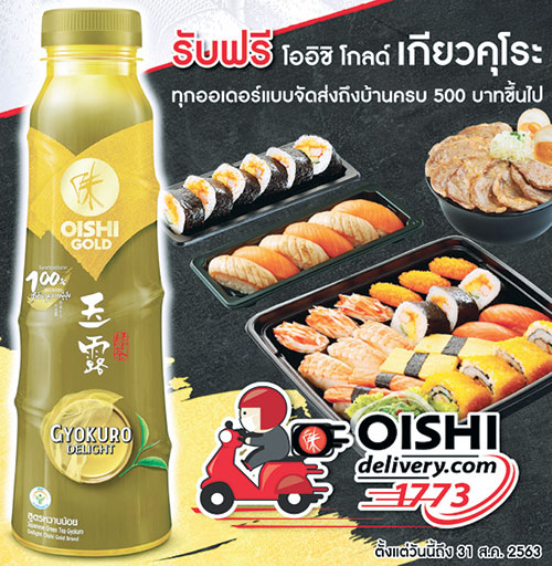 “โออิชิ เดลิเวอรี่” ชวนชิม “โออิชิ โกลด์ เกียวคุโระ” ชาเขียวสูตรหวานน้อย ฟรี! เมื่อสั่งอาหารหลากหลาย อาทิ เบนโตะ เซต,ดงบุริ, ราเมน, ซูชิ มากิ ฯลฯกว่า 100 รายการ ครบ 500 บาท ถึง 31 ส.ค. โทร.1773
