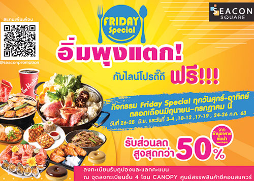 “Friday Special” ชวนชิม อิ่มพุงแตก กินฟรีและแจกส่วนลดสูงสุด 50% ทุกวันศุกร์ ถึง 31 ก.ค.ที่ ศูนย์สรรพสินค้าซีคอนสแควร์ ถนนศรีนครินทร์ โทร.02-7218888