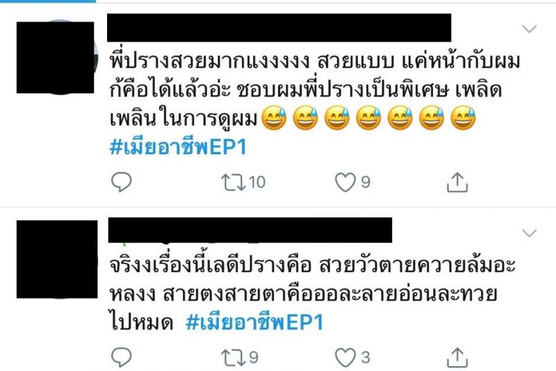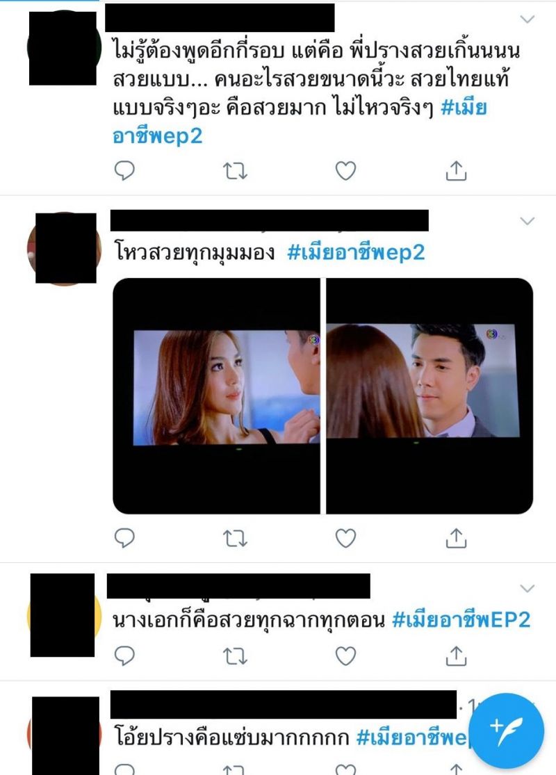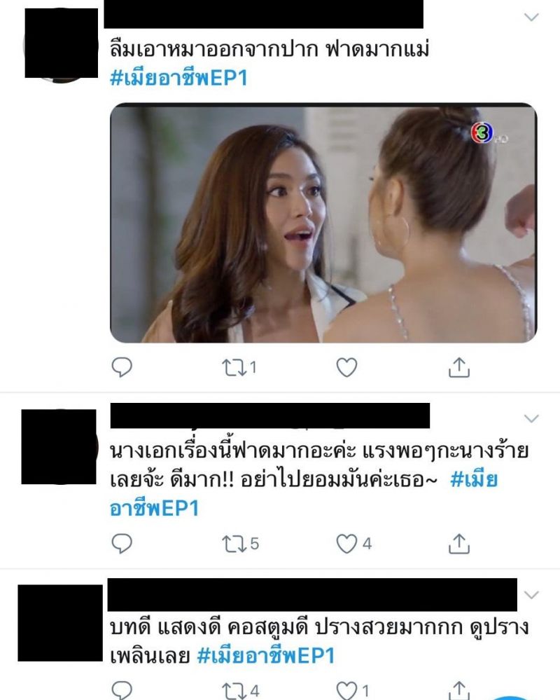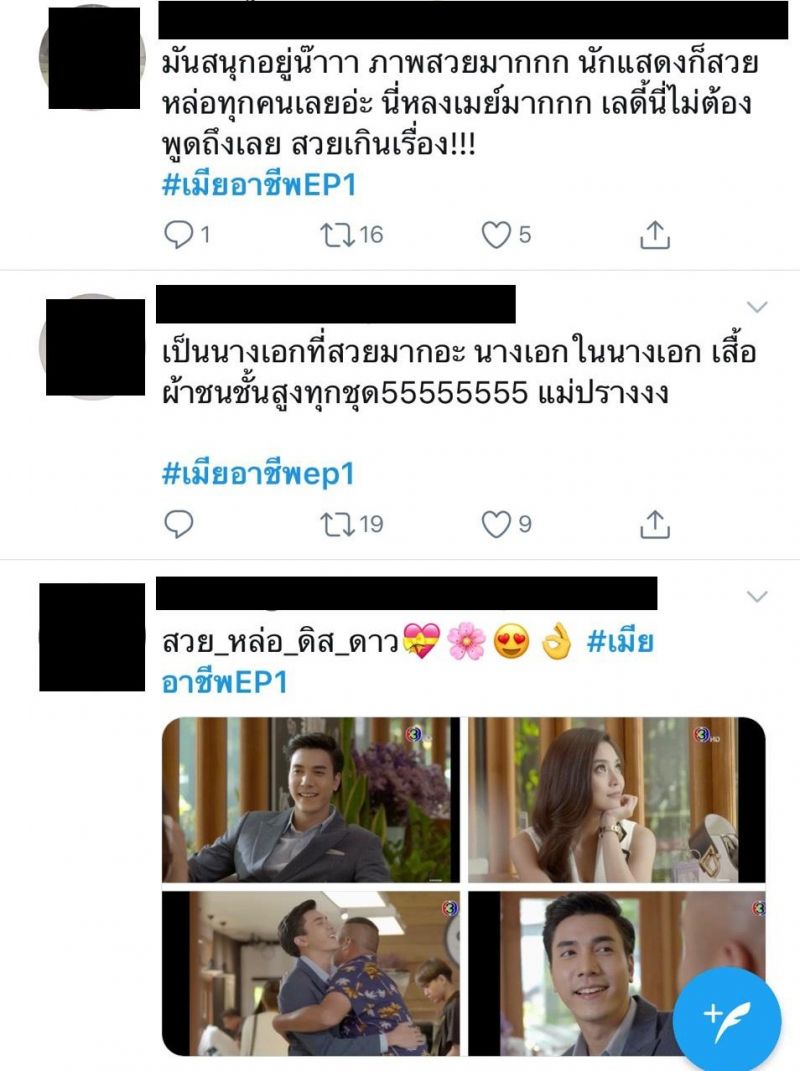 ฟาดไฟลุก ตั้งแต่ตอนแรกกันเลยทีเดียว สำหรับ ละครรักโรแมนติก คอมเมดี้ “เมียอาชีพ” ช่อง 3 ของผู้จัด “อุ๊-พัชนี จารุจินดา” แห่งค่าย “สเต็ปออนเวิร์ด”นำแสดงโดย “ปราง กัญญ์ณรัณ” และ “ไม้ วฤษฎิ์”ต้องบอกว่าเคมีของพระนางคู่นี้ คือ ความสดใหม่ที่ดีงาม เพราะตั้งแต่ตอนแรกที่เปิดตัวพระนาง ปรางและไม้ แฟนละครต่างพูดเป็นเสียงเดียวกันว่า “โดนตกไปเต็มๆ”โดยเฉพาะออร่า ของสาวปราง ที่ดาเมจรุนแรงมาก สวยทุกลุกซ์ สะดุดตาทุกฉาก สวยแบบไม่มีอะไรกั้นเรียกว่าออกมากี่ฉาก เสื้อผ้า หน้าผม เป๊ะปัง ดูแพง เซ็กซี่มาก ด้านไม้ ก็หล่อ รวย เนี๊ยบ เฉียบ ดุ หุ่นสุดฟิตแอนด์เฟิร์ม ส่วนฝีมือการแสดง และบทของคู่นี้ ต้องบอกว่า ถูกใจแฟนละครที่ชอบปะทะมาก เพราะบท “ดาว” ของปรางนั้น ยืนหนึ่งในเรื่องนางเอกสายสู้ แรงมาแรงกลับไม่โกง ตอกกลับจนนางร้ายในเรื่อง “แอนนา” รับบทโดย “เม–นิศาชล ต้วมสูงเนิน”หงายเงิบ อาทิ หน้าสวยๆ นี่หมอหรือแม่ให้มา ฟากพระเอก “กษิดิศ” หนุ่มไม้ ก็สวมบทบาทได้ละมุนโดนใจสาวๆ อย่างแรง จนแฟนละครยกให้เป็น “สามีสายอ่อย” ทำเอารถอ้อยคว่ำกันเลยทีเดียวด้านคู่ปรับทั้งเรื่องธุรกิจ และหัวใจ อย่าง “มหานที” ที่รับบทโดย “บอล กัมมัญญ์ กลมแก้ว”ในความหล่อโอปป้า ชั้นเชิงการจีบสาว ก็แพรวพราวได้เรื่อง ส่วนเรื่องความกวน คู่นี้กินกันไม่ลง เอาเป็นว่า ปราง-เม และ ไม้-บอล ต่างก็เป็นมวยถูกคู่ของจริงหลังจากนี้ ความเผ็ดร้อน ความฟิน ยังมีให้อิ่มแบบจุใจ ครบรสรอชมทุกวันพุธ – พฤหัสบดี เวลา 20.20 น. ทางช่อง 3 กด 33ส่วนฟีดแบคจากชาวโซเชี่ยลจะพูดถึงอย่างไรกันบ้าง ไปดูกัน
