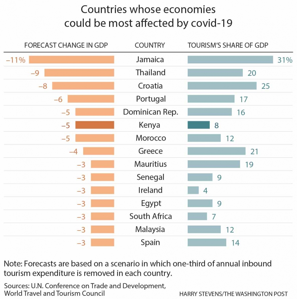 In Kenya, where 8% of the economy is directly derived from tourism, the gross domestic product is forecast to shrink by 5%. Other tourism-dependent economies like Jamaica and Thailand could see declines of around 10% or more, according to the United Nations. International flights to Kenya resume on Aug. 1, but arrivals are expected to be limited by continued restrictions on travel imposed by European and Asian countries.