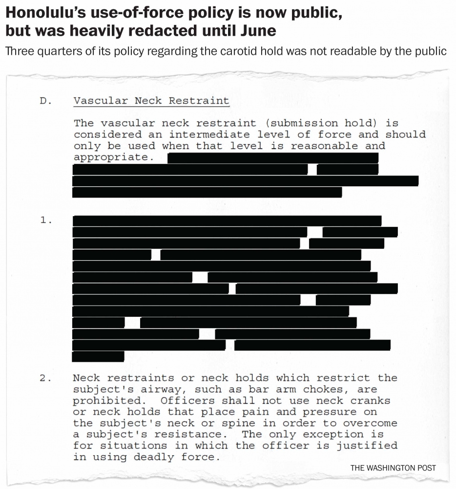 Other departments are less transparent about neck-restraint guidance, although that is also starting to change. In four cases, use-of-force policies posted on department websites as late as June were heavily redacted. The Honolulu Police Department’s policy, which had most of the section on carotid holds blacked out, has since been replaced by one with no redactions. Houston police also eliminated the black marks.