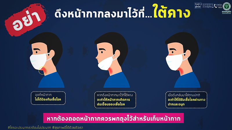 In a Facebook post on Tuesday (July 21), the Public Health Ministry issued a warning against pulling the face mask down to the chin, even temporarily, as the mask could collect germs from the unprotected neck area and transfer them via the nose and mouth when the mask is pulled back up.