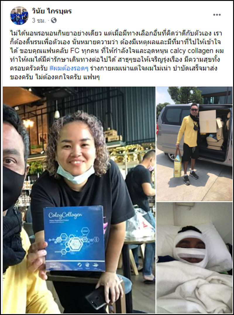 “ไม่ได้นอนรอนอนกินยาอย่างเดียว แต่เมื่อมีทางเลือกอื่นที่คิดว่าดีกับตัวเอง เราก็ต้องดิ้นรนเพื่อตัวเอง นั่นหมายความว่า ต้องมีเหตุผลและมีที่มาที่ไปให้เข้าใจได้ ขอบคุณแฟนคลับ FC ทุกคน ที่ให้กำลังใจและอุดหนุน calcy collagen ทำให้ผมมีค่ารักษาเดินทางต่อไปได้ สาธุๆ ขอให้เจริญรุ่งเรือง มีความสุขทั้งครอบครัวครับ #ผมต้องรอดๆ ร่างกายผมเน่าแต่ใจผมไม่เน่า”