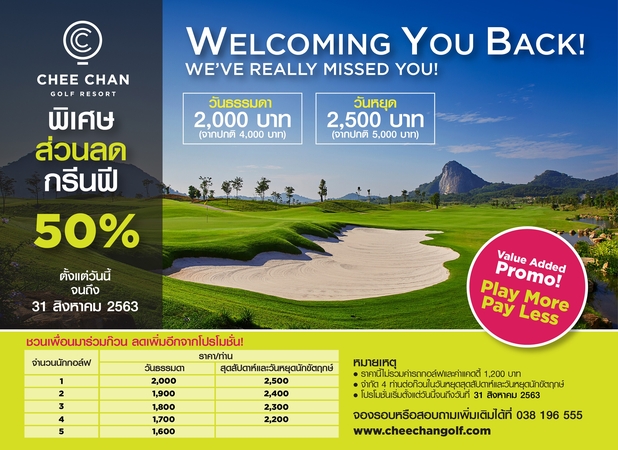 Chee Chan Golf Resort extends its current “Play More, Pay Less” Promotion to the end of August, 2020. Golfers will be offered more discount up to 400 Baht per person added on the current 50% green fee discount when bringing more friends to play at Chee Chan Golf Resort.
