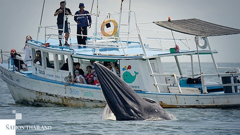 A Bryde’s whale emerged from the water in the Gulf of Thailand on Monday (July 27), wowing tourists who were passing on a boat trip.