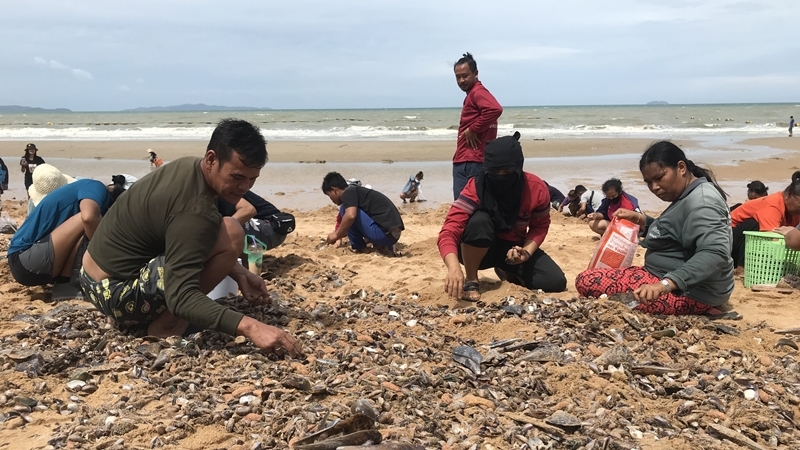 People in Bang Lamung district woke up to the sight of clams and mussels in their hundreds and thousands washed up on the shore after the fierce storm blew through Thailand.