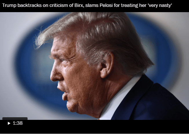 In a news conference Monday evening, Trump said that he has “a lot of respect” for Birx and that he thinks Pelosi has treated her “very, very badly.”