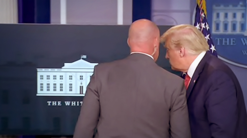 Just before Trump’s briefing at the White House was interrupted, law enforcement could be seen taking positions on the driveway in front of the entrance to the press room. A uniformed officer appeared outside the double doors and locked them from the outside.