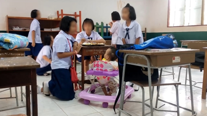 Ban Huay Mai Sod School in Bueng Kan province is seeking donations for a 10-year-old student who has to bring her infant sister to class because their parents are not around to take care of them.
