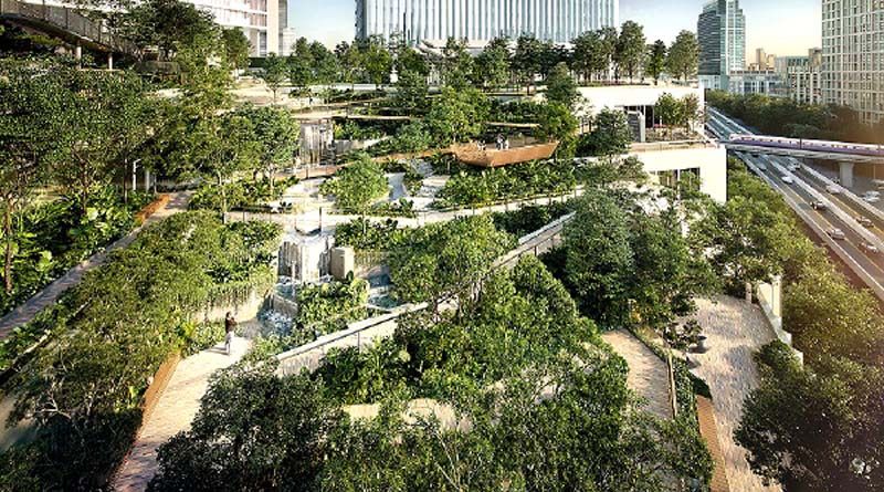 ความสร้างสรรค์และความท้าทายของการออกแบบภูมิสถาปัตย์ของโครงการมิกซ์ยูส ขนาดใหญ่มูลค่ากว่าสามหมื่นล้านบาทโครงการนี้อยู่ที่การออกแบบและปรับพื้นที่ทั้งหมดให้มีการเชื่อมต่อของชั้นดาดฟ้าเริ่มที่ดาดฟ้าชั้น 3 ไล่ไปถึงชั้น 6 และต่อเนื่องถึงชั้น 7 ประมาณความสูงของพื้นที่ 20 เมตร จึงทำให้พื้นที่ 7 ไร่ของรูฟพาร์ค คือการสร้างสรรค์พื้นที่แนวสูงใจกลางเมือง ให้แวดล้อมด้วยสภาพธรรมชาติที่เอื้อให้เกิดระบบนิเวศ (Ecosystem) และนิเวศเมือง (Urban Ecology) ยกระดับคุณภาพสิ่งแวดล้อมเมืองที่สร้างความสุขความร่มรื่นให้กับการใช้ชีวิตของผู้คนยุคนี้