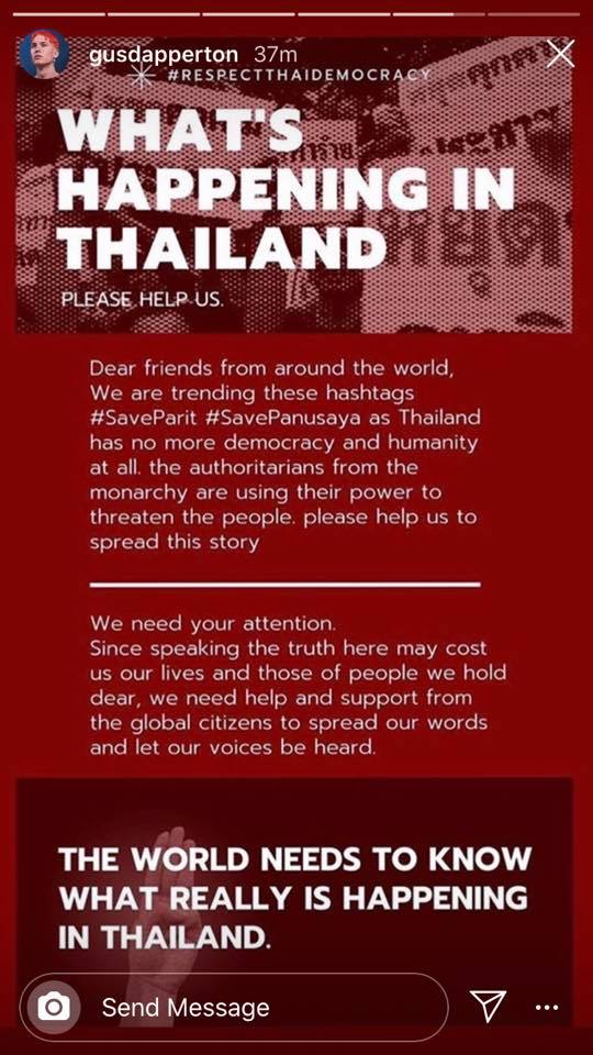 They said they are aware of the problem and have spoken out about the injustice that has occurred in Thailand by taking a stand through IG Stories. Other artists such as HMLTD, Homeshake, Will Murray (FUR lead singer) have also come out to express their support.